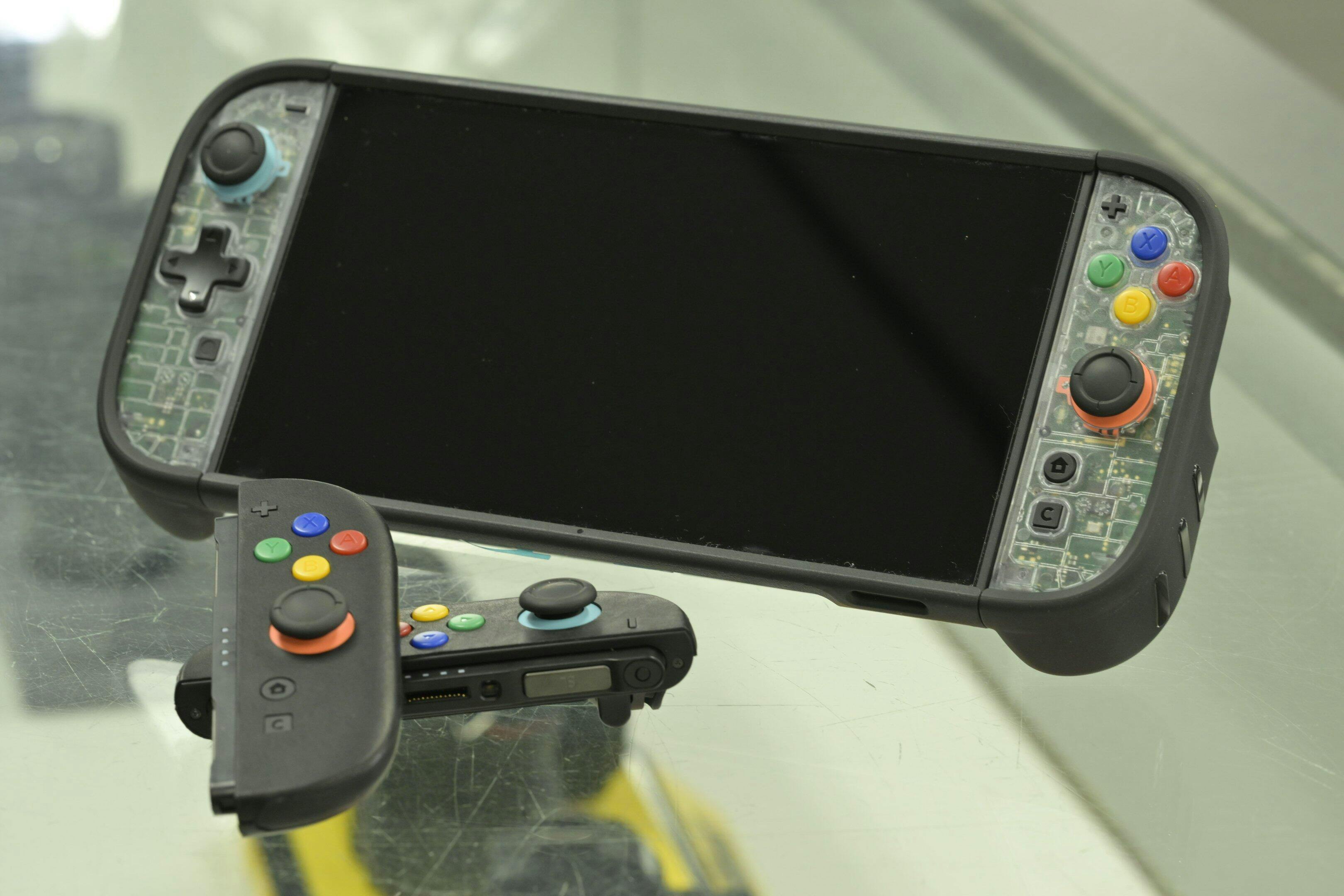 Pictured are my two sets of modified Joy Cons 2, with mixed original Nintendo parts, and Dbrand covers